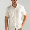 Essa camisa de linho misto é daquelas peças que unem o melhor dos dois mundos: o frescor e a leveza do linho com o toque macio e o conforto do algodão. A manga curta e a estampa discreta fazem dela uma escolha certeira pra quem gosta de se vestir bem, sem esforço.