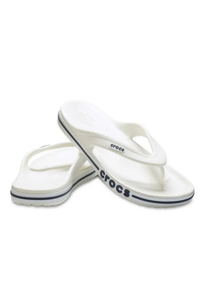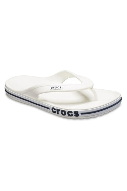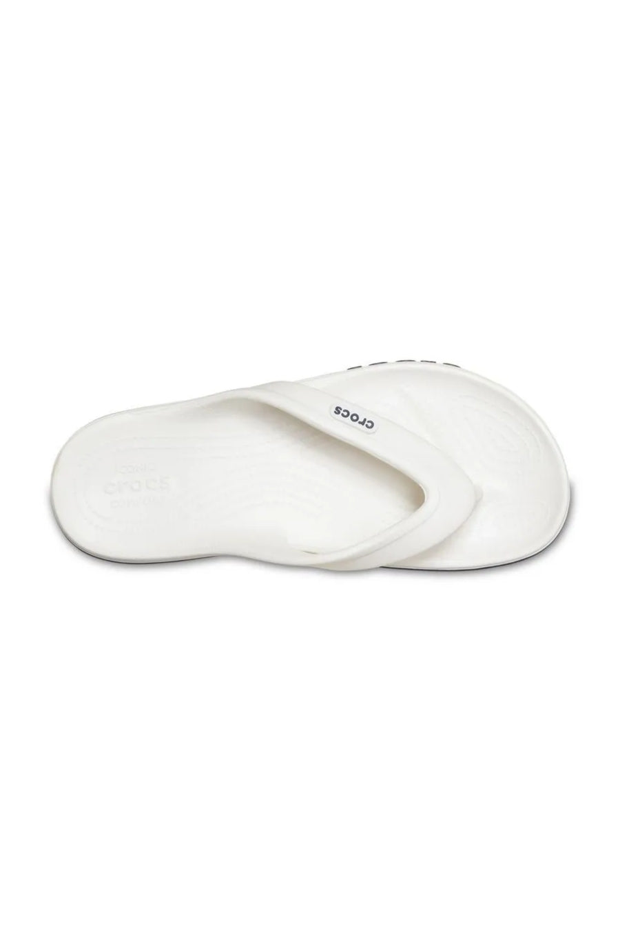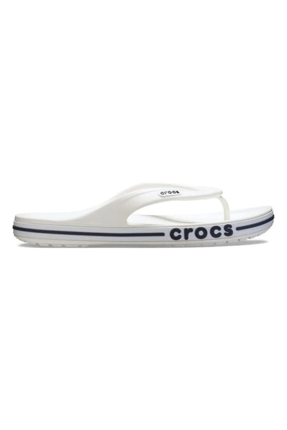 Chinelo Crocs Bayaband Flip é confeccionado em Croslite. Traz divisor de dedos, tira com logo da marca, além de palmilha com esferas massageadoras e listras na lateral do solado.