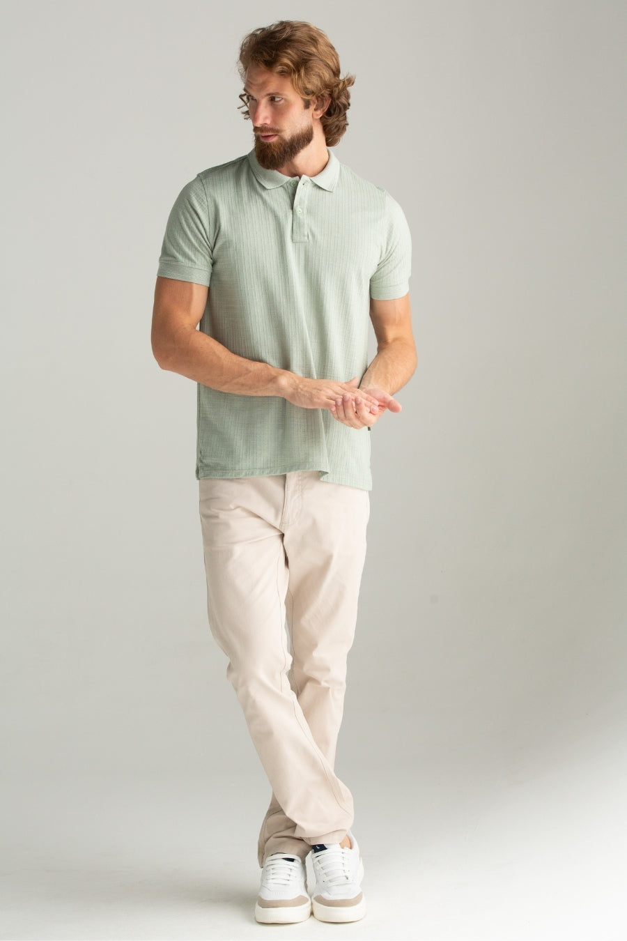 Polo confeccionada em malha Madras, com textura sofisticada e visual elegante. Sua composição equilibrada — algodão, poliéster e linho — garante conforto, leveza e durabilidade, além de um toque diferenciado. Com caimento impecável e acabamento refinado, é a escolha ideal para quem busca uma peça versátil, moderna e com personalidade.
